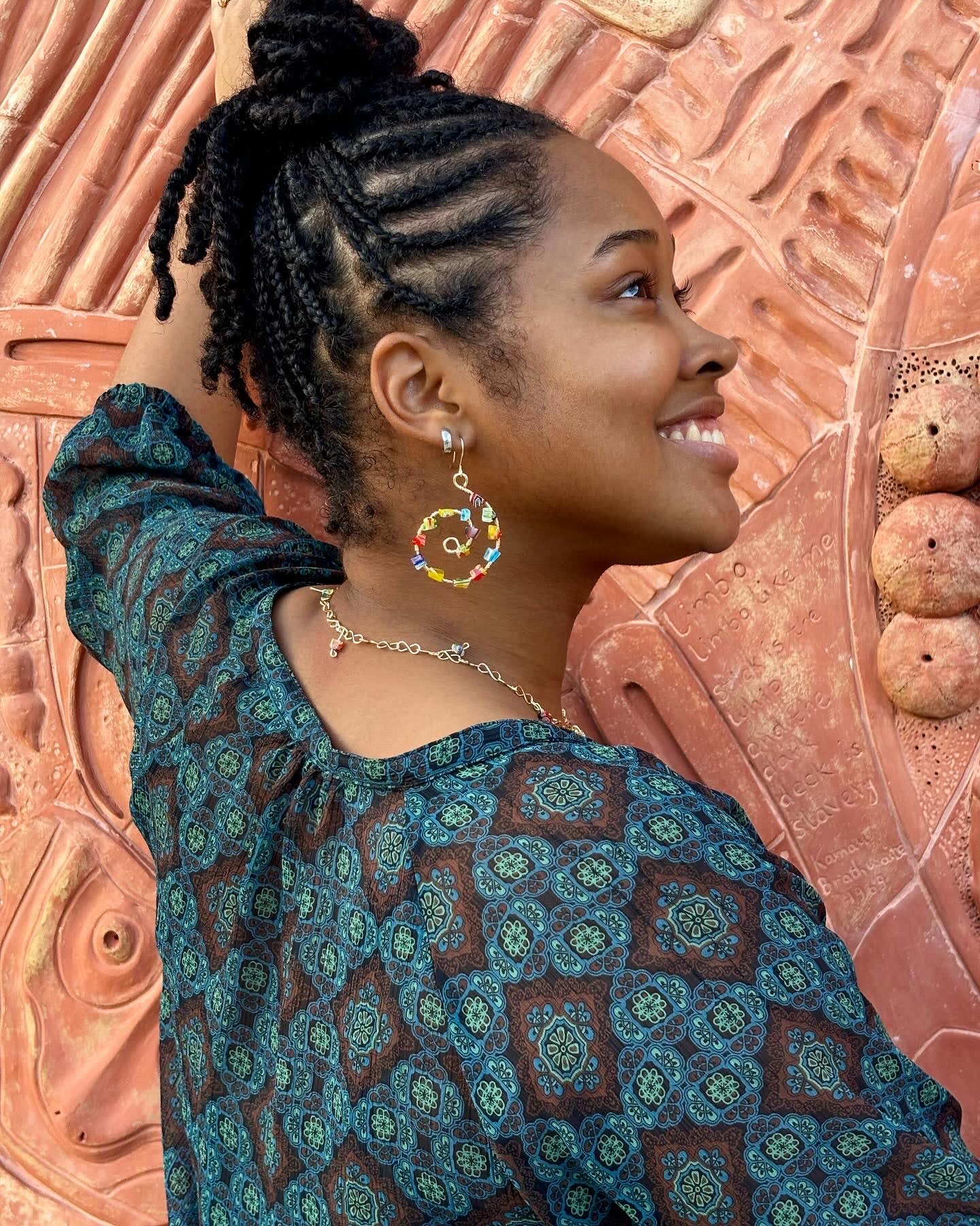 Our Island Gyal Earrings are crafted from tarnish-resistant copper wire in a radiant gold hue, adorned with vibrant glass beads. Inspired by our beloved Barbados print, these earrings capture the essence of tropical allure and playful charm.